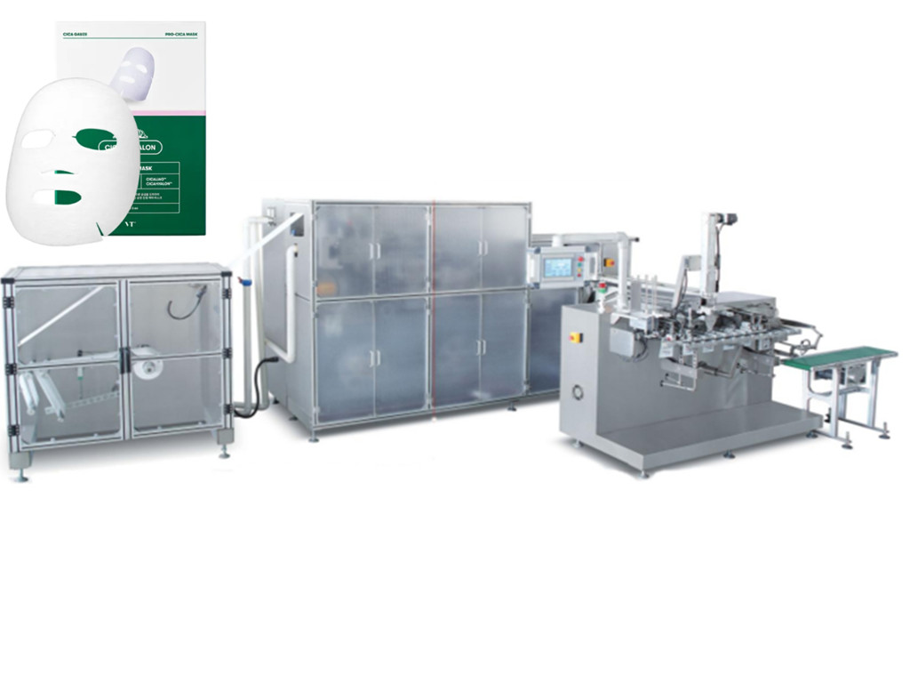 This is a fully automatic facial mask packing machine. it's designed by our technical person according to the current situation of cosmetic line, which has got many prizes and country invention patents. It can automatically complete from nonwoven rolling cutting mask shape , mask folding, feeding mask into pouch, adding liquid, top sealing, printing,output ect. It fully colored the deficiency of current cosmetic market and it is our best choice of facial mask packing machinery equipment.